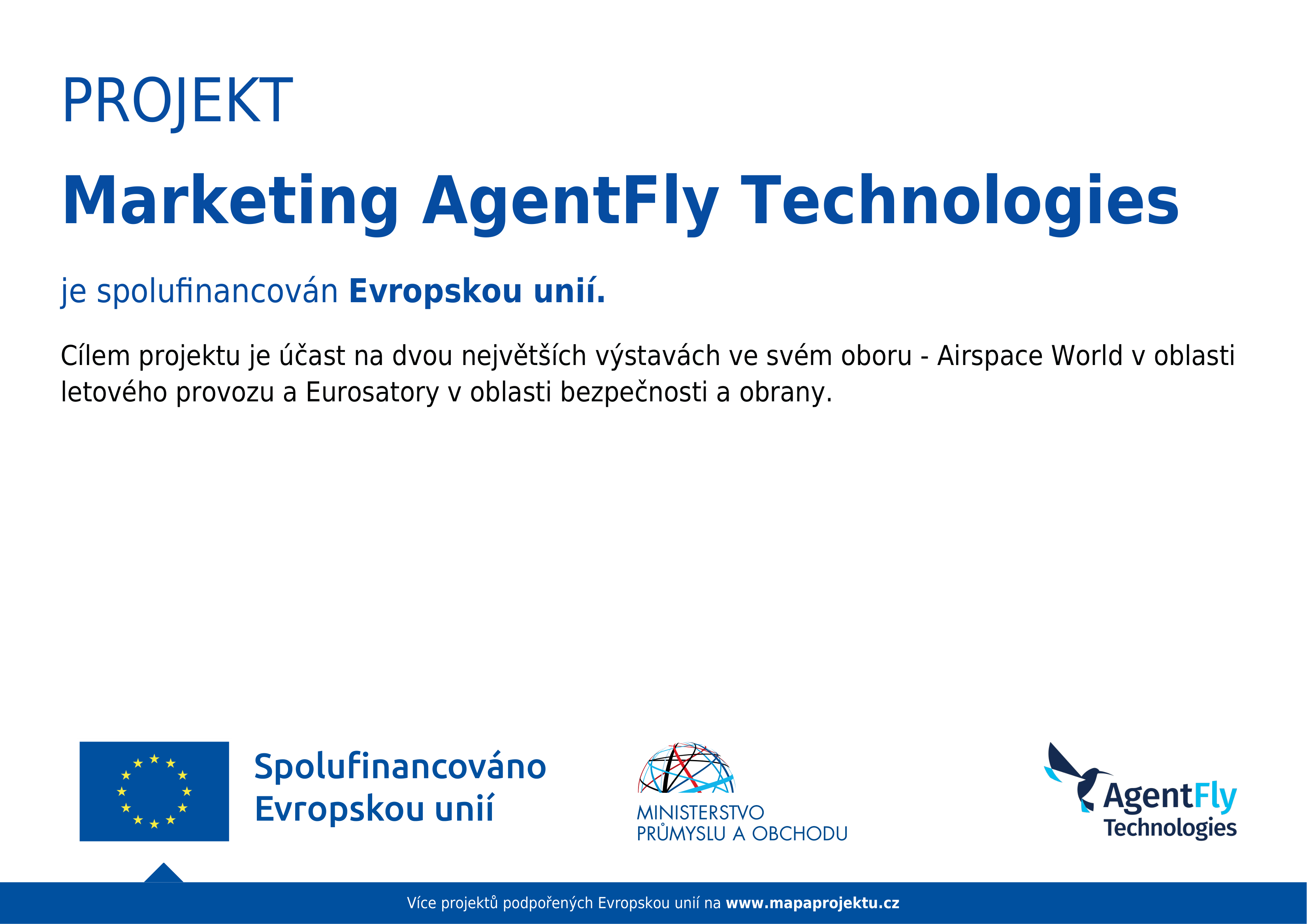| Tento projekt umožnil AgentFly Technologies účast na dvou významných světových veletrzích – Airspace World 2024 v Ženevě a Eurosatory 2024 v Paříži. Díky finanční podpoře jsme mohli představit naše produkty a služby zahraničním zákazníkům a partnerům, což by bez této pomoci bylo obtížně dosažitelné. Účast na těchto akcích nám otevřela nové obchodní příležitosti, posílila naši konkurenceschopnost na globálním trhu a umožnila nám reprezentovat nejen AgentFly, ale i Českou republiku v oblasti pokročilých technologií. | This project enabled AgentyFly to participate in two major global trade fairs – Airspace World 2024 in Geneva and Eurosatory 2024 in Paris. Thanks to the financial support, we were able to present our products and services to international customers and partners, which would have been difficult to achieve otherwise. Participation in these events opened up new business opportunities, strengthened our competitiveness in the global market, and allowed us to represent not only AgentFly but also the Czech Republic in the field of advanced technologies. |