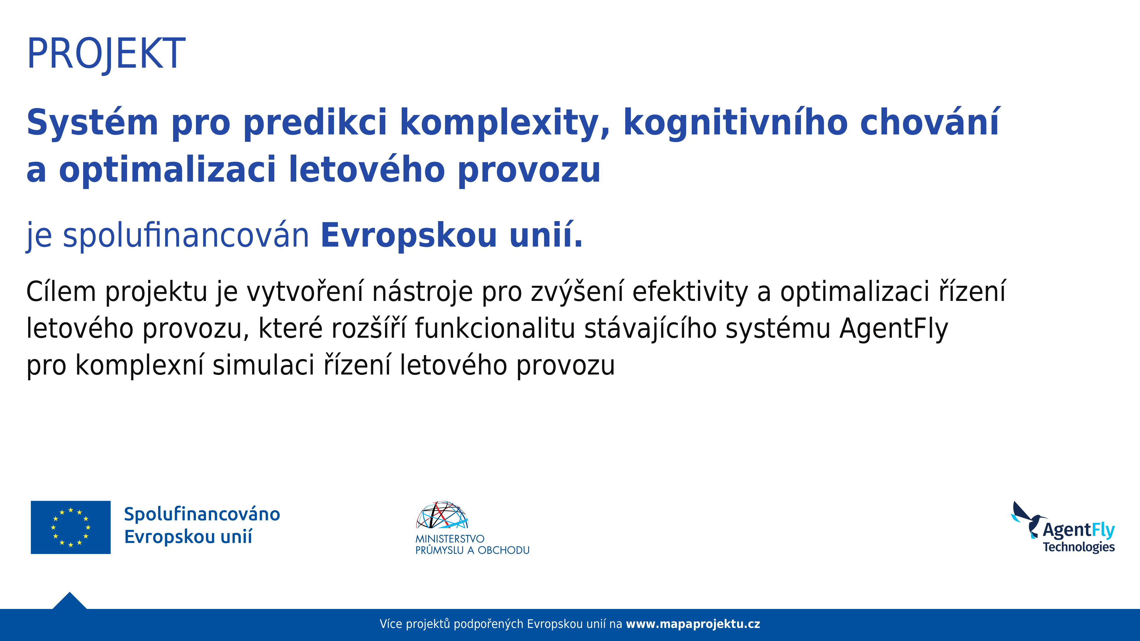 | AgentFly Technologies vystupuje v projektu jako hlavní technologický partner odpovědný za vývoj a implementaci predikčního nástroje pro odhad zátěže řídících letového provozu a komplexity letového provozu. Společnost využívá svůj simulační systém AgentFly jako základní platformu pro vývoj, integraci a testování řešení a zajišťuje implementaci softwarového modulu, přípravu rozsáhlých simulačních dat a scénářů a praktické ověření funkčnosti v simulovaném prostředí. V projektu AFT dále rozvíjí své kompetence v oblasti analýzy velkých dat, návrhu provozních metrik a využití metod umělé inteligence a strojového učení pro predikci provozní komplexity. Výsledný nástroj bude integrován do systému AgentFly a připraven pro další komercializaci a využití při optimalizaci sektorizace vzdušného prostoru a plánování kapacit v řízení letového provozu. | AgentFly Technologies (AFT) acts as the main technological partner in the project and is responsible for the development and implementation of a predictive tool for estimating air traffic controller workload and air traffic complexity. The company uses its AgentFly simulation system as the core platform for development, integration, and testing of the solution, and is responsible for implementing the software module, preparing large-scale simulation datasets and scenarios, and validating the functionality of the tool in a simulated environment. Within the project, AFT further develops its capabilities in big data analysis, operational metric design, and the application of artificial intelligence and machine learning methods for predicting traffic complexity and controller workload. The resulting tool will be integrated into the AgentFly system and prepared for future commercialization and use in airspace sectorization optimization and air traffic management capacity planning. |